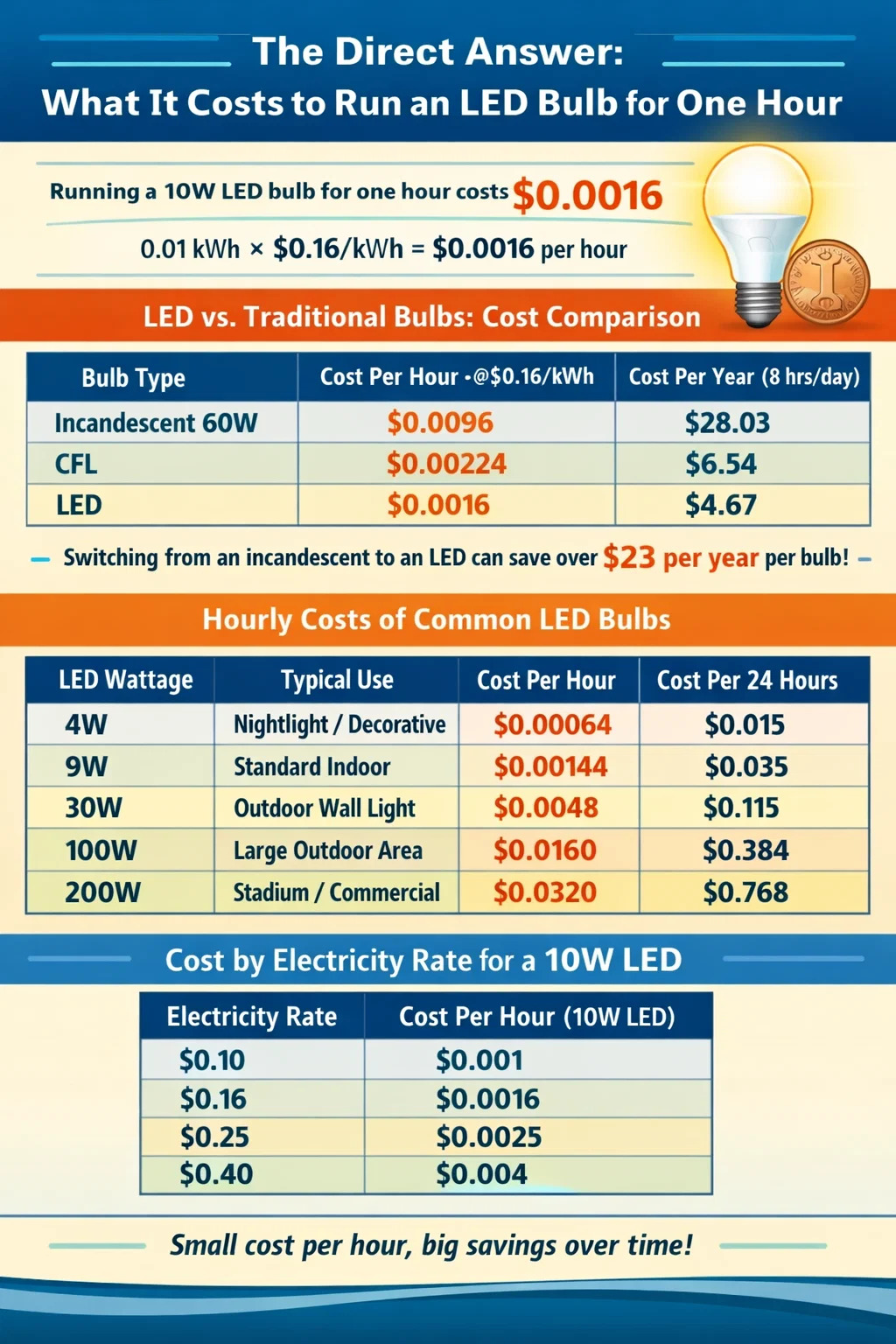Para un LED de 10W a $0,16/kWh: (10 ÷ 1000) × 0,16 = $0.0016 por hora .