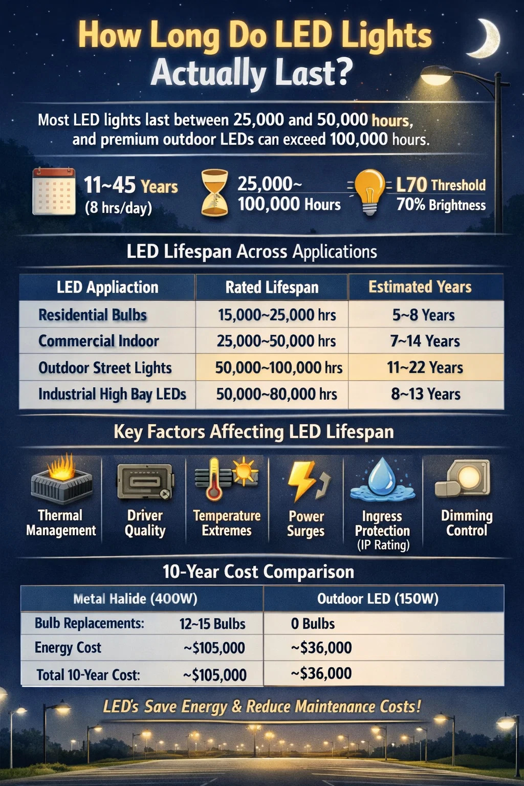 La respuesta corta: la mayoría de las luces LED duran entre 25.000 y 50.000 horas y los productos de iluminación LED para exteriores de primera calidad a menudo superan ese rango, alcanzando hasta 100.000 horas en condiciones óptimas. Eso se traduce en aproximadamente entre 11 y 45 años de uso en el mundo real si los ejecuta durante un promedio de 8 horas por día. Si comparamos esto con las bombillas incandescentes tradicionales, que se queman después de sólo 1.000 horas, o con los tubos fluorescentes que duran unas 10.000 horas, la diferencia de rendimiento resulta difícil de ignorar.